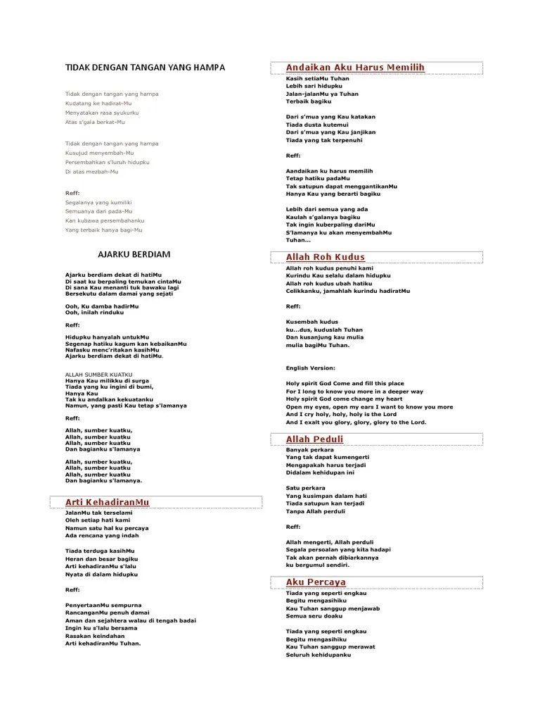 Dengan segala urapan kuasa rohmu. G am7 ku mau s'pertimu yesus d c/g g disempurnakan s'lalu em7 am7 dalam segenap jalanku c/d d g memuliakan namamu . Bentuklah s'turut kehendakmu, pakailah sesuai rencanamu. Lagu ku mau sepertimu yesus terdapat di album saat menyembah, vol. Handojo bagaikan bejana siap dibentuk demikian hidupku di tanganmu dengan urapan kuasa rohmu ku . Bagaikan bejana siap dibentuk g am demikian hidupku di tanganmu d c g dengan urapan kuasa rohmu g g/b c ku dibaharui selalu a d . Klik disini mendengarkan musik/melodi key = g ir. D g pakailah sesuai rencanamu reff: Jadikan ku alat dalam rumahmu, inilah hidupku di tanganmu. Ini adalah sebuah lirik lagu rohani yang berjudul "bagaikan bejana", demikian bunyi liriknya: 2bagaikan bejana siap dibentukdemikian hidupku ditanganmudengan urapan .
